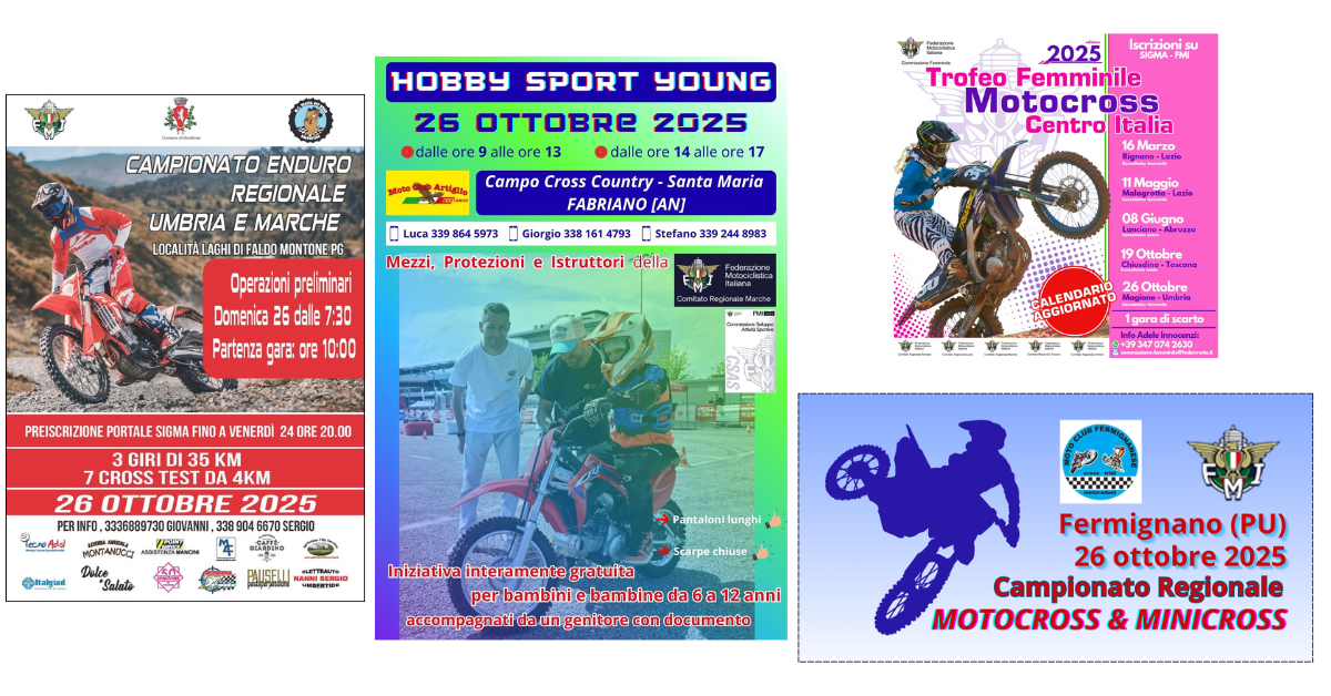 • il 5 luglio il Motoclub Montesanvitese organizza a Monte San Vito la 5a prova del Campionato Regionale Marche del MiniEnduro, Enduro Sprint e Trofeo Quad Sprint; iscrizioni su https://sigma.federmoto.it/